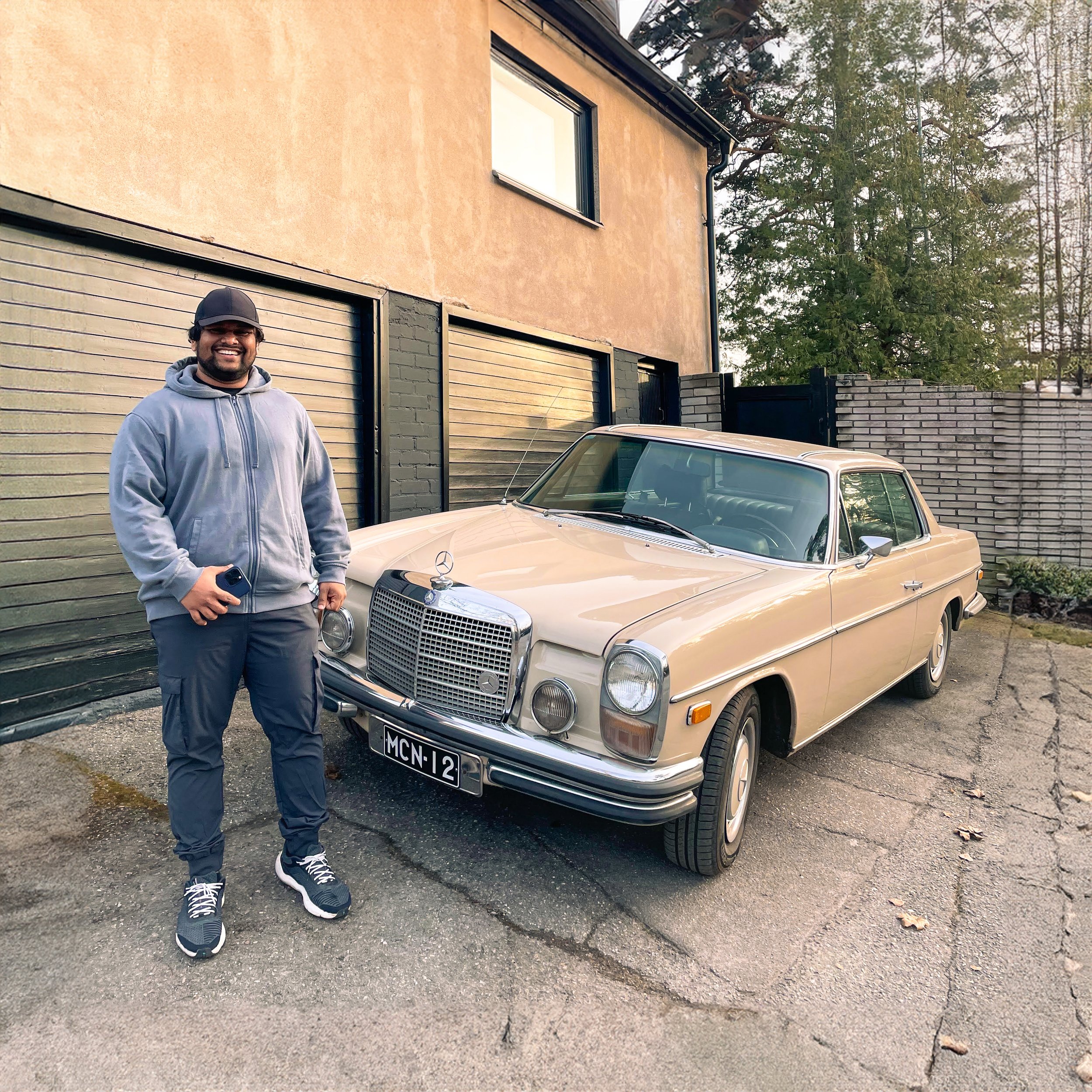 The photo: A candid shot by my girlfriend, capturing a moment as I pause to admire this classic late 60s Mercedes-Benz 250 CE Coupé (W114) during one of our evening walks.